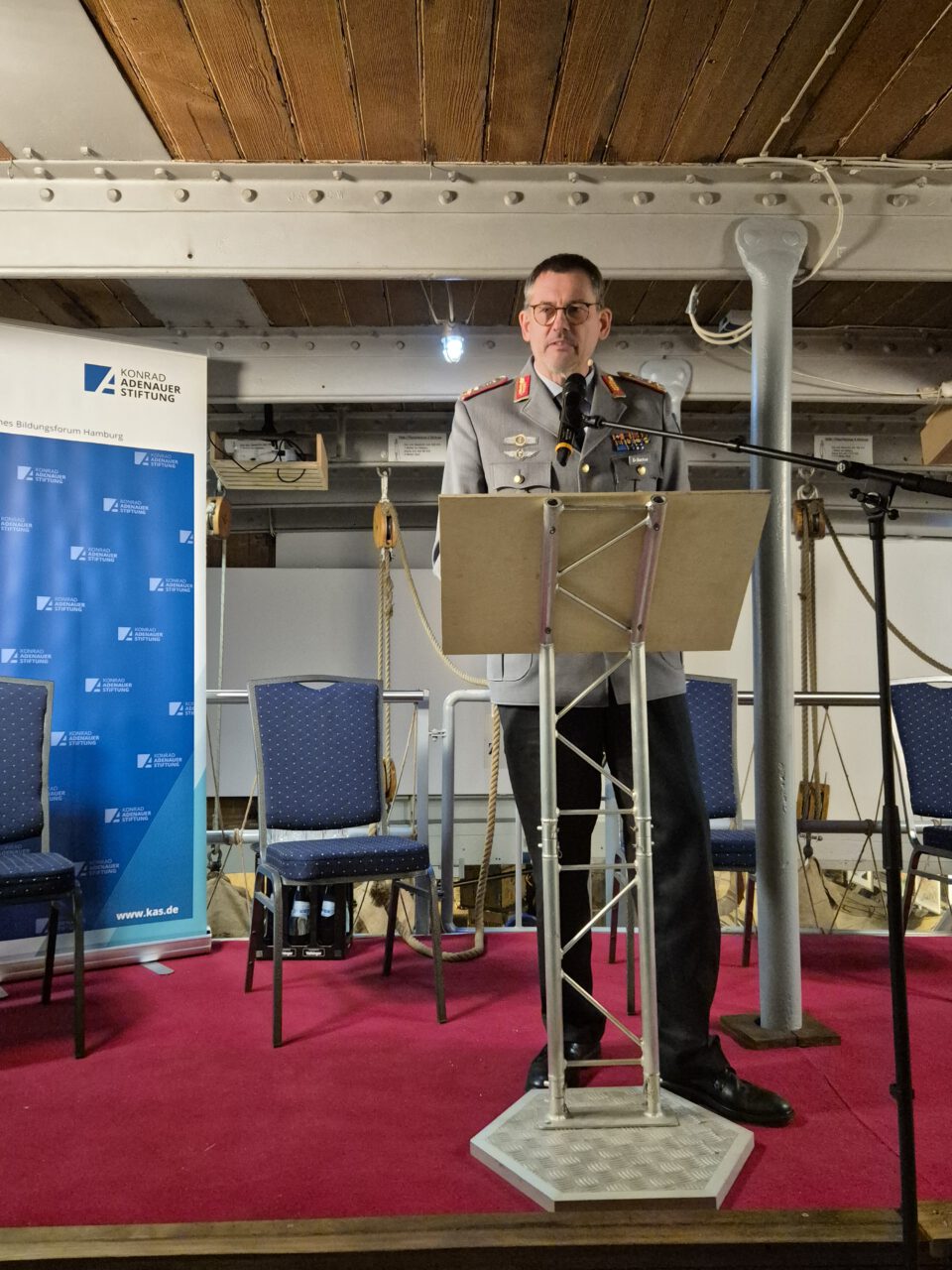 Neben zwei Kurzimpulsen von Dr. Backus und Prof. Richardt ergab die anschließende Podiumsdiskussion, dass das Gesundheitssystem bereits heute, im Frieden, in Schwierigkeiten steckt: schwierige Finanzierung, zu wenig Fortschritt in der Digitalisierung, knapper werdende Arztzeit, wachsender Pflegebedarf bei Fachkräftemangel. Für Krisen und mögliche Konfliktfälle würden sich enorme zusätzliche Belastungen für das System ergeben, da in einem solchen Fall nicht nur die übliche Gesundheitsversorgung der Bevölkerung sichergestellt werden müsste, sondern auch die der Soldaten der Bundeswehr und von NATO Partnern. Bei ca. 1.000-1.200 verletzten Soldaten, mit denen zu rechnen wäre, eine Herkulesaufgabe!