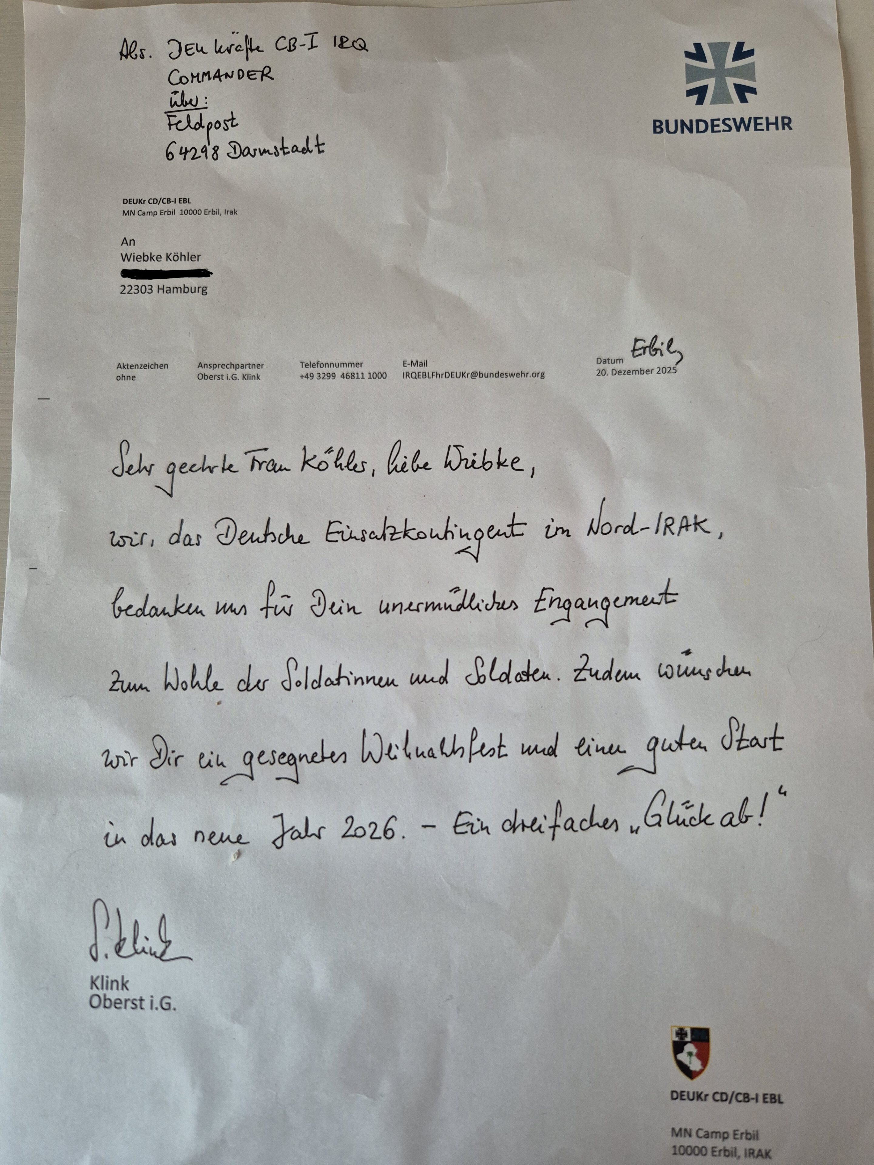 Heute erhielt ich die beste Postsendung überhaupt! Einen Brief vom deutschen Kontingent im Irak bzw. in Kurdistan. In Erbil sind derzeit im Rahmen von Counter Daesh / Capability Building 500 Soldaten der Bundeswehr stationiert. Sie sind Teil einer internationalen Allianz gegen die Terrororganisation IS, die bis Januar 2027 verlängert wurde. Die dort stationierten Kräfte unterstützen den Fähigkeitsaufbau der kurdischen Peschmerga- und irakischen Sicherheitskräfte durch Ausbildung, Beratung und logistische Unterstützung, um ein Wiedererstarken des IS zu verhindern.